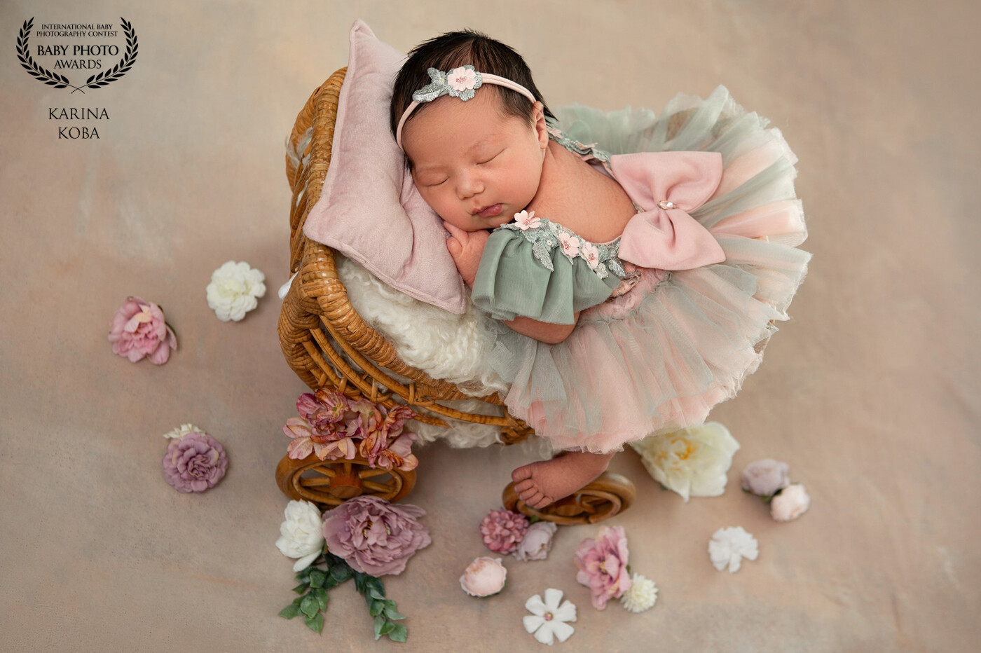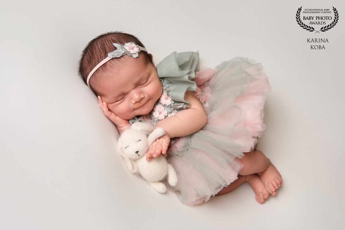 This delicate newborn portrait captures grace and sweetness in its purest form. Dressed in airy pastels and holding a tiny plush companion, the baby rests in a peaceful dream, surrounded by softness and light. Every detail tells a story of gentleness, new beginnings, and the fleeting beauty of the newborn stage.