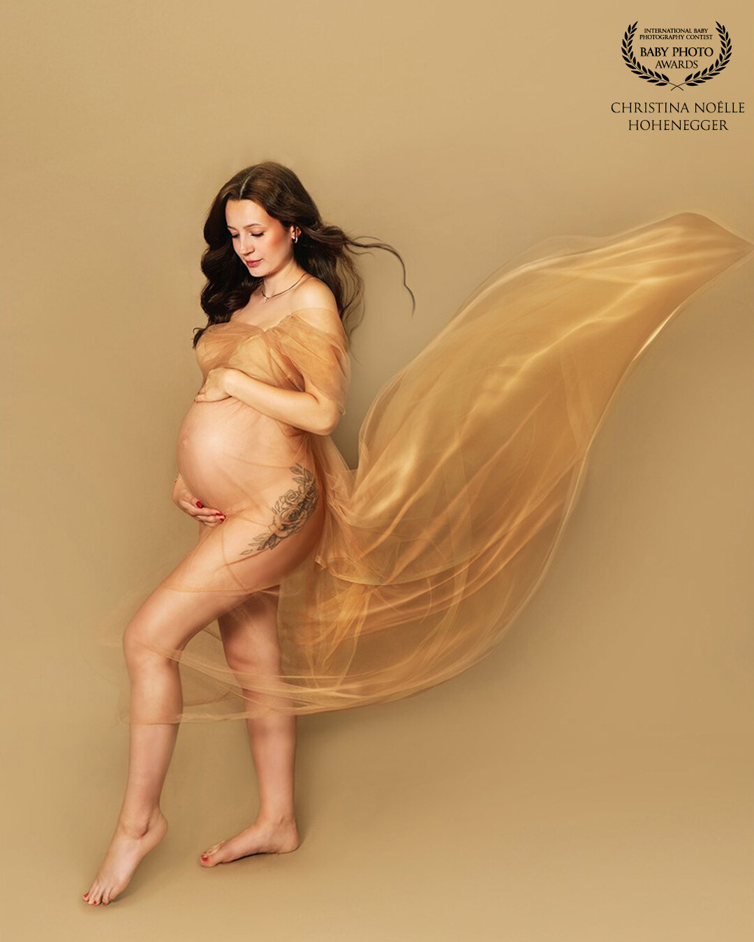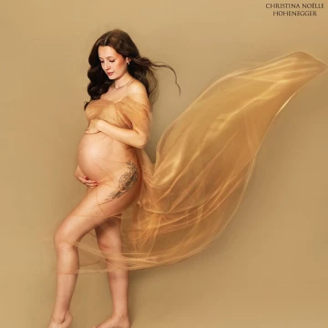 Wrapped in flowing, translucent fabric, the mother-to-be radiates strength, serenity, and timeless femininity. The warm, earthy tones and gentle movement of the veil create an ethereal atmosphere that beautifully highlights the curves of new life. Her pose feels both powerful and tender, capturing the quiet miracle of motherhood in its purest form.