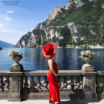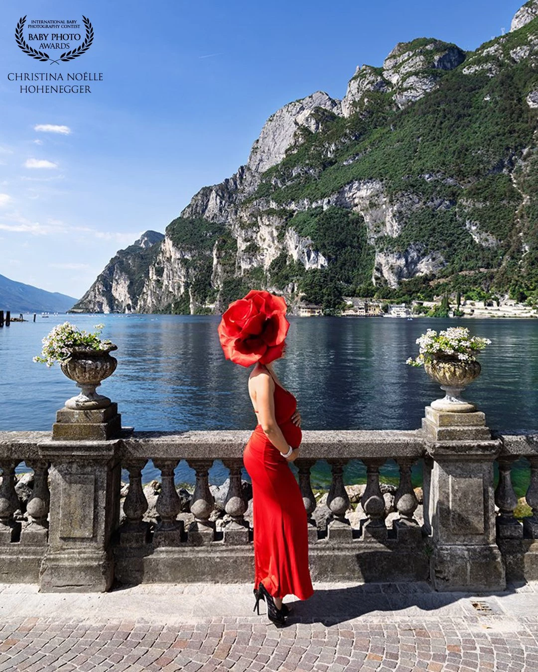 118th CollectionSet against the breathtaking backdrop of Lake Garda, this striking portrait celebrates motherhood with bold elegance. The vivid red gown and sculptural floral headpiece create a dramatic contrast to the serene landscape of mountains and water, symbolizing passion, life, and beauty. It is a powerful tribute to the grace and confidence of a woman embracing new beginnings.